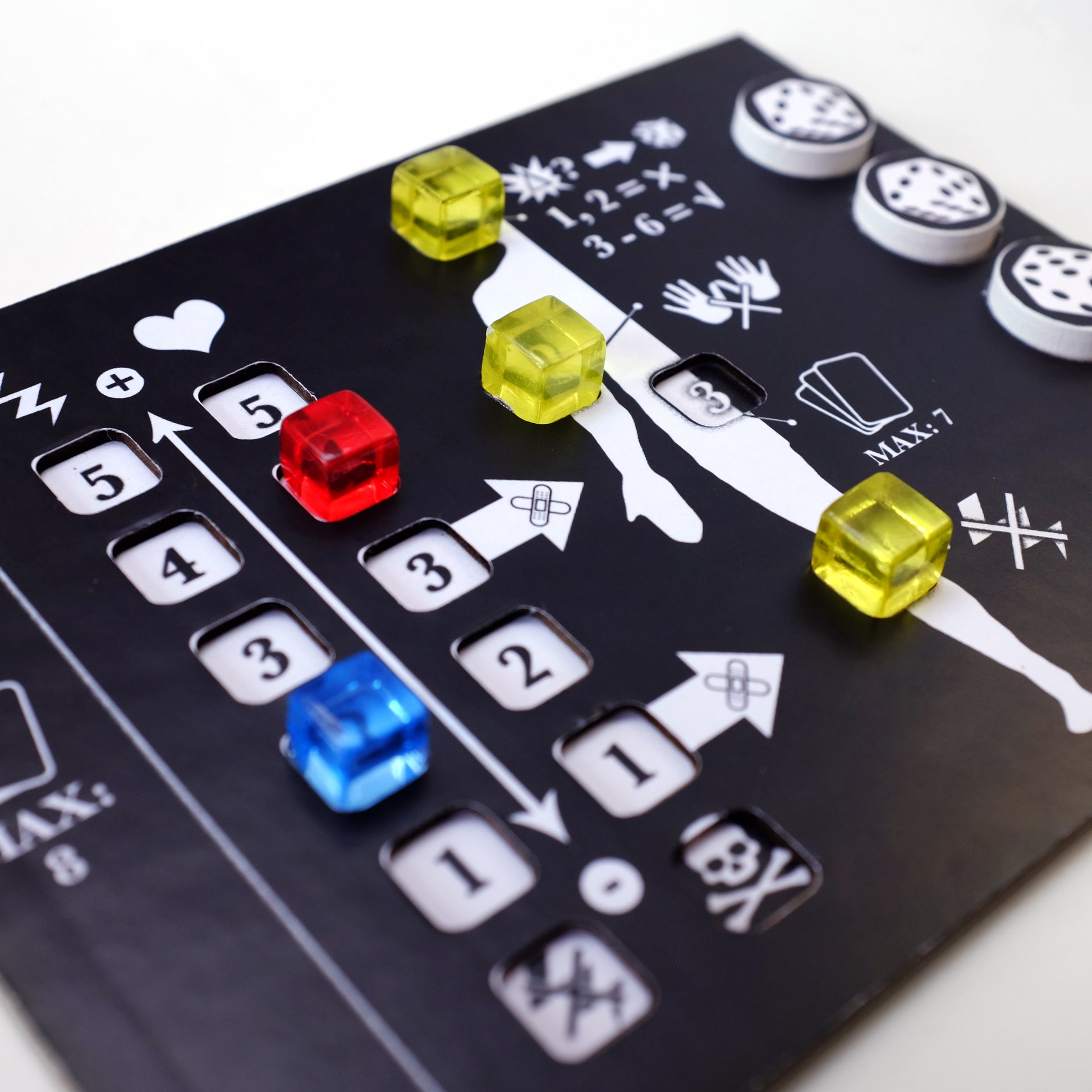 Además de los archivos descargables, para jugar requerirás**: 8 dados (5 negros, 1 dado blanco, 2 dados rojos), 1 peón madera natural, 1 peón de madera rojo, 10 cubos de madera, 5 cubos acrílico (3 amarillos, 1 rojo, 1 azul), 91 tarjetas. **todos los materiales, excepto los dados, se pueden reemplazar por materiales cotidianos como fichas, monedas, o incluso semillas.